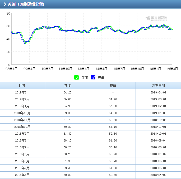 美國ISM制造業(yè)指數(shù)從去年7月份的60.2下滑到現(xiàn)在的54.2。
