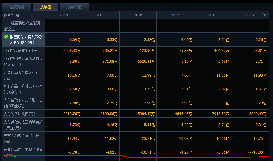 每一年的經(jīng)營(yíng)現(xiàn)金凈流量都是大幅負(fù)值,這樣的報(bào)表,說明利潤(rùn)很可能九成九都是虛增的,甚至是完全虛假的。