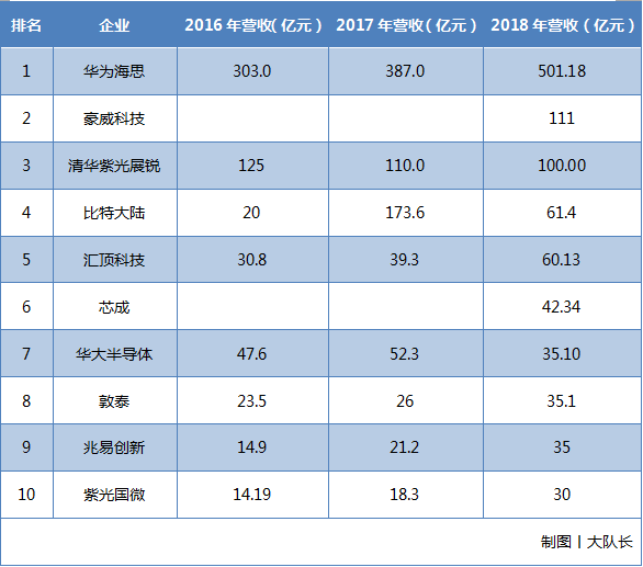 國(guó)內(nèi)2018年半導(dǎo)體設(shè)計(jì)企業(yè)收入排名,海思2018年以501.18億元人民幣排名第一,遙遙領(lǐng)先第二名。