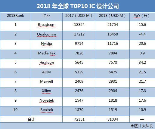 國(guó)內(nèi)沒有對(duì)手,那就放眼全球,2018年海思收入75.73億美元,落后于博通(218億)、高通(165億)、因特爾(117億)和臺(tái)灣的聯(lián)發(fā)科(79億),排名世界第5名,但是34%的增速遠(yuǎn)遠(yuǎn)高于前十12%的增速,進(jìn)入前三甚至第一或許只是時(shí)間問題。