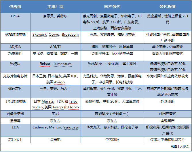 華為的大部分產(chǎn)品線所需進(jìn)口的零部件均存在國(guó)產(chǎn)替代產(chǎn)品,但很多國(guó)產(chǎn)器件的性能暫時(shí)無法達(dá)到華為現(xiàn)有的“一流”供應(yīng)商,少部分產(chǎn)品只能在低端市場(chǎng)或者部分環(huán)節(jié)實(shí)現(xiàn)替代。